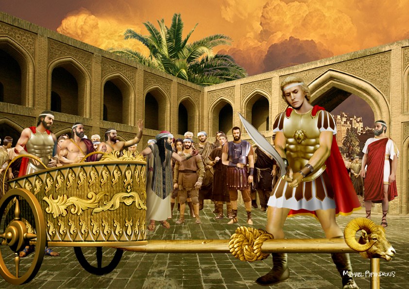 [2,3,1] Όταν ο Αλέξανδρος έφθασε στο Γόρδιο, κυριεύθηκε από μεγάλη επιθυμία να ανέβει στην ακρόπολη, όπου ήταν τα ανάκτορα του Γόρδιου και του γιου του Μίδα,1 για να δει την άμαξα του Γόρδιου καθώς και το ζυγόδεσμο2 της άμαξας. [2] Για την άμαξα εκείνη κυκλοφορούσε ανάμεσα στους γείτονες μια πολύ διαδεδομένη παράδοση: ο Γόρδιος ήταν ένας άνθρωπος φτωχός, καταγόμενος από τους παλιούς Φρύγες, που είχε μικρή έκταση καλλιεργήσιμης γης και δυο ζευγάρια βόδια· με το ένα όργωνε το χωράφι του και το άλλο το έζευε στην άμαξα. [3] Ενώ λοιπόν κάποια μέρα όργωνε το χωράφι του, ένας αετός κάθισε πάνω στο ζυγό και εξακολούθησε να κάθεται σε αυτόν ώς την ώρα που ξέζεψε τα βόδια του. Ο Γόρδιος ταράχτηκε από την εμφάνιση του αετού και πήγε να ανακοινώσει το θεϊκό σημάδι στους μάντεις Τελμισσείς·3 γιατί οι Τελμισσείς γνώριζαν καλά να εξηγούν τα θεϊκά σημάδια, επειδή είχε παραχωρηθεί στους ίδιους, στις γυναίκες και στα παιδιά τους από γενιά σε γενιά το χάρισμα της μαντείας. [4] Ενώ λοιπόν πλησίαζε σε ένα χωριό των Τελμισσέων, συνάντησε ένα κορίτσι που έπαιρνε νερό και της διηγήθηκε, πώς έγινε η εμφάνιση του αετού· εκείνη λοιπόν, που καταγόταν επίσης από το μαντικό γένος, του υπέδειξε να προσφέρει θυσία στον Δία τον βασιλιά, ξαναγυρίζοντας στο ίδιο μέρος. Ο Γόρδιος την παρακάλεσε να τον ακολουθήσει και να του υποδείξει, πώς να κάμει τη θυσία· αυτός πράγματι πρόσφερε τη θυσία κατά τον τρόπο που τον συμβούλευσε η κόρη, την παντρεύτηκε και απέκτησε μαζί της ένα γιο που τον ονόμασαν Μίδα. [5] Και ήταν πια άνδρας ο Μίδας, ωραίος και ευγενικός, όταν οι Φρύγες ταλαιπωρούνταν από εμφύλια διαμάχη· τους δόθηκε τότε χρησμός ότι μια άμαξα θα τους φέρει βασιλιά και ότι αυτός θα καταπαύσει τη διαμάχη τους. Και ενώ ακόμη συσκέπτονταν για το ζήτημα αυτό, ήρθε ο Μίδας μαζί με τον πατέρα και τη μητέρα του και παρουσιάστηκε στη λαϊκή συνέλευση με την άμαξά του. [6] Ερμηνεύοντας οι Φρύγες το χρησμό κατάλαβαν ότι ο Μίδας ήταν ο άνδρας που τους είχε πει ο θεός ότι θα τον έφερνε η άμαξα· ανακήρυξαν λοιπόν βασιλιά τους τον Μίδα· αυτός τους σταμάτησε την εμφύλια διαμάχη και αφιέρωσε την άμαξα του πατέρα του στην ακρόπολη ως ευχαριστήρια προσφορά στον Δία τον βασιλιά, γιατί έστειλε τον αετό. Κυκλοφορούσε ακόμα η εξής παράδοση σχετικά με την άμαξα. Όποιος θα έλυνε το ζυγόδεσμό της, αυτός ήταν πεπρωμένο να εξουσιάσει την Ασία. [7] Ο ζυγόδεσμος αυτός ήταν κατασκευασμένος από φλοιό κρανιάς4 και δεν φαινόταν ούτε η αρχή ούτε το τέλος του. Ο Αλέξανδρος δεν μπορούσε να βρει τρόπο να λύσει το ζυγόδεσμο, αλλά δεν ήθελε να τον αφήσει και άλυτο, μήπως αυτό προκαλέσει κάποια αναταραχή στον κόσμο. Άλλοι συγγραφείς αναφέρουν ότι χτύπησε με το ξίφος του το ζυγόδεσμο, τον έκοψε και είπε ότι τον έλυσε· ο Αριστόβουλος όμως λέει ότι ο Αλέξανδρος, αφού αφαίρεσε από τον άξονα το μικρό πάσσαλο, που ήταν ένα ξύλινο καρφί περασμένο πέρα-πέρα μέσα στον άξονα για να συγκρατεί το ζυγόδεσμο, τράβηξε το ζυγόδεσμο έξω από τον άξονα. [8] Εγώ πάντως δεν είμαι σε θέση να βεβαιώσω, με ποιο τρόπο έλυσε ο Αλέξανδρος το ζυγόδεσμο. Αυτός όμως και η συνοδεία του απομακρύνθηκαν από την άμαξα με την πεποίθηση ότι είχε εκπληρωθεί ο χρησμός ο σχετικός με το λύσιμο του ζυγόδεσμου. Και πράγματι εκείνη τη νύχτα βροντές και αστραπές το επιβεβαίωσαν· γι᾽ αυτό την επόμενη μέρα ο Αλέξανδρος πρόσφερε θυσία στους θεούς που φανέρωσαν τα θεϊκά σημάδια και τ