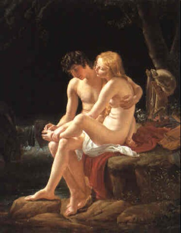 [1.13.1] Πήγε λοιπόν ο Δάφνης μαζί με τη Χλόη στο Νυμφαίο και της έδωσε να του φυλάει το ρούχο και το ταγάρι, ενώ ο ίδιος στάθηκε μπροστά στην πηγή κι άρχισε να πλένει τα μαλλιά του κι όλο του το σώμα. [1.13.2] Τα μαλλιά του ήταν μαύρα και πυκνά και το κορμί του ηλιοψημένο, τόσο που θα ᾽λεγες πως το χρωμάτιζεν ο ίσκιος των μαλλιών. Ατενίζοντας τον Δάφνη η Χλόη τον βρήκε ωραίο και, καθώς δεν της είχε φανεί ωραίος ως τότε, πίστεψε πως το λουτρό ήταν που τον ομόρφαινε. Την ώρα που του έπλενε τη ράχη ένιωθε το δέρμα του τρυφερό, και κάθε τόσο κρυφάγγιζε το δικό της κορμί για να διαπιστώσει αν τούτο ήταν ακόμα τρυφερότερο. [1.13.3] Σε λίγο —κόντευε να βασιλέψει ο ήλιος— πήγαν τα κοπάδια στις στάνες, και το μόνο ασυνήθιστο που έπαθε η Χλόη εκείνη τη φορά ήταν ότι της έμεινε η επιθυμία να ξαναδεί τον Δάφνη να λούζεται. [1.13.4] Την άλλη μέρα, σαν έφτασαν στο βοσκοτόπι, ο Δάφνης κάθισε κάτω από την αγαπημένη του βελανιδιά κι άρχισε να παίζει φλογέρα, θωρώντας τα γιδοπρόβατα που είχαν πλαγιάσει κι έμοιαζαν να αφουγκράζονται τα τραγούδια του. Η Χλόη, καθισμένη στο πλάι του, πρόσεχε βέβαια και το κοπάδι της, πιο πολύ όμως κοίταζε τον Δάφνη. Ξανά της φάνταξε ωραίος καθώς έπαιζε τη φλογέρα, αλλά και τούτη τη φορά νόμισε πως η μουσική ήταν που τον ομόρφαινε· γι᾽ αυτό πήρε κατόπι εκείνη τη φλογέρα, μήπως ομορφύνει κι η ίδια. [1.13.5] Έπειτα τον κατάφερε να λουστεί και πάλι. Την ώρα που λουζόταν τον είδε, κι αφού τον είδε τον άγγιξε, και φεύγοντας τον παίνεψε ξανά — κι αυτό το παίνεμα στάθηκε αρχή έρωτα. Νέο κορίτσι καθώς ήταν, μεγαλωμένη στην εξοχή όπου ποτέ δεν είχε ακούσει κανένα μήτε τ᾽ όνομα του έρωτα να προφέρει, δεν ήξερε τί ήταν αυτό που της λάχαινε. Θλίψη κυβερνούσε την ψυχή της, έκλαιγε ασυγκράτητα και πρόφερνε συχνά τ᾽ όνομα του Δάφνη. [1.13.6] Ανόρεχτη στο φαγητό, άγρυπνη τις νύχτες, αδιαφορούσε για το κοπάδι της· πότε γελούσε, πότε έκλαιγε· τη μια κοιμόταν, την άλλη τιναζόταν όρθια· το πρόσωπό της άλλοτε χλώμιαζε κι άλλοτε πάλι αναψοκοκκίνιζε. Μήτε αγελάδα τσιμπημένη από αλογόμυγα δε θα βασανιζόταν τόσο. Κάποτε που ήταν μόνη, της ήρθαν σκέψεις σαν και τούτες: