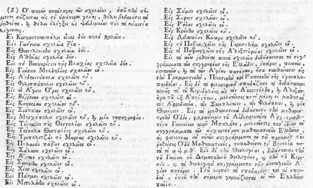 Ο παρών κατάλογος των σχολείων, όπου την σήμερον σώζονται εις το ημέτερον Γένος, θέλει βεβαιώσει τα ρηθέντα και θέλει ελέγξει ως ψευδομένους τους τα ενάντια λέγοντας |