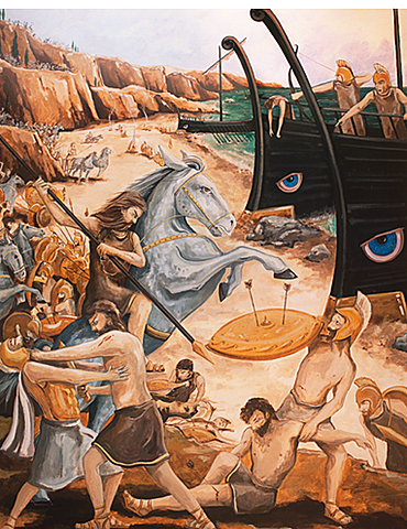 μέσα τούς τράβηξα στα βαθουλά καράβια, στα ζυγά τούς έδεσα.