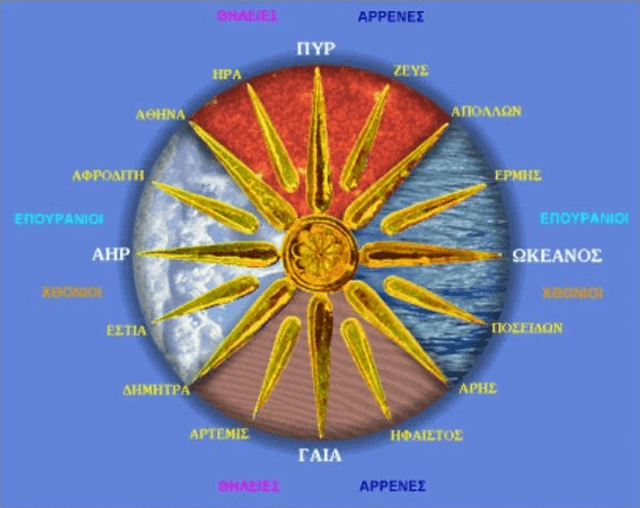 Ο Ήλιος με τις δεκαέξι ακτίνες αντιπροσωπεύει τα εξής: Οι 4 ακτίνες αντιπροσωπεύουν τα 4 στοιχεία της φύσης, ΓΗ – ΘΑΛΑΣΣΑ – ΦΩΤΙΑ – ΑΕΡΑΣ και οι υπόλοιπες 12 ακτίνες αντιπροσωπεύουν τους 12 Θεούς του Ολύμπου.