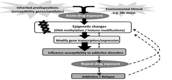 Ο τρόπος που αυτές οι αλλαγές στη συμπεριφορά λαμβάνουν χώρα, μπορεί να υποδηλώνουν μακροχρόνιες αλλαγές στη γονιδιακή έκφραση, σε συγκεκριμένες περιοχές του εγκεφάλου, και συμβάλλουν σημαντικά στην εγκαθίδρυση της εξάρτησης. Έρευνες που έχουν διεξαχθεί την τελευταία δεκαετία έχουν δείξει τον κρίσιμο ρόλο των επιγενετικών μηχανισμών, οι οποίοι οδηγούν σε μόνιμες αλλαγές στη γονιδιακή έκφραση σε διάφορους ιστούς, στους οποίου συμπεριλαμβάνεται και ο εγκέφαλος (Wong et al., 2011).